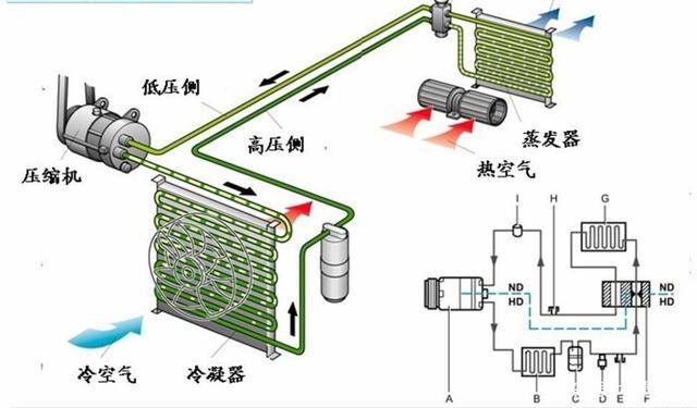 空調具體工作原理這里不再贅述,與家用空調原理類似(除了不能制熱之外)。蒸發器相當于一個制冷芯,空氣吹過蒸發器后溫度降下來,也就是冷氣的來源。對于手動空調來講,蒸發器帶有一個溫控開關,當蒸發器溫度在4℃左右的時候,溫控開關就會斷開這時候壓縮機就會停止工作,此時蒸發器溫度極低、還可以持續的為空氣降溫。當蒸發器溫度升高后溫控開關接通,壓縮機開始工作。因此當溫控開關損壞的時候壓縮機會持續工作,蒸發器會結冰。